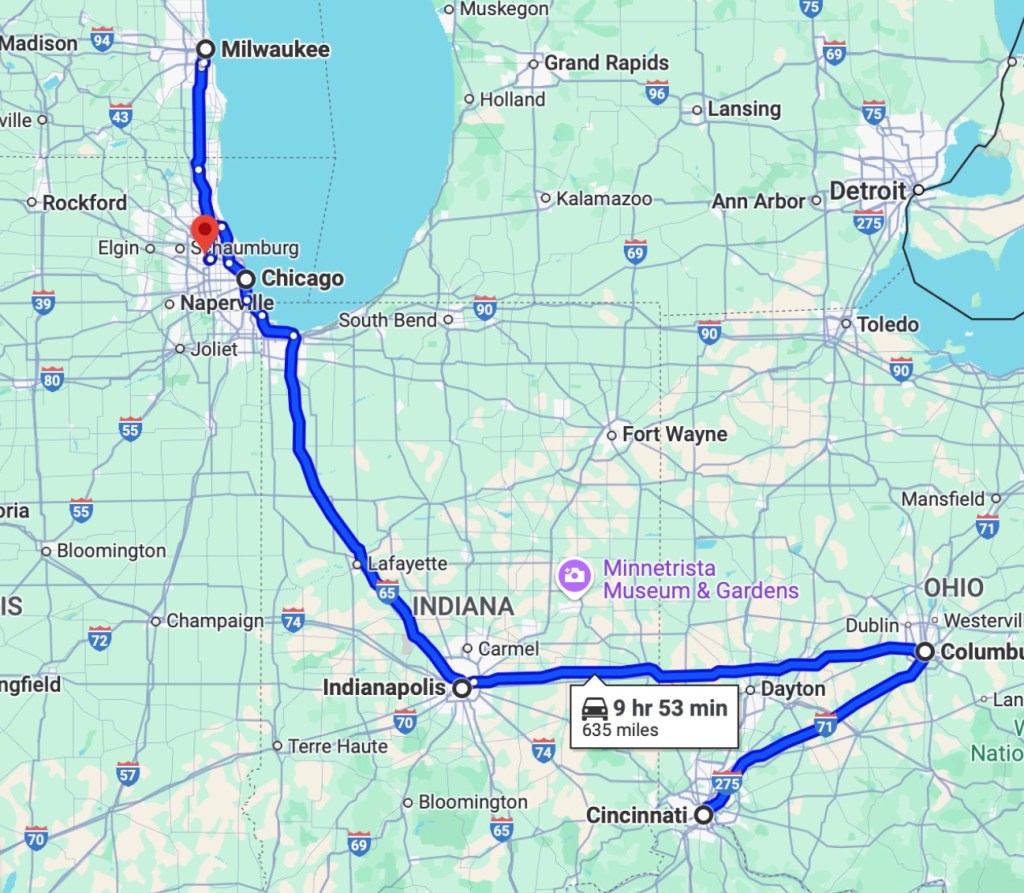 I drove all this except for Cincinnati/Columbus/Indiapolis – these sectors we were very kindly driven by Brian and Michelle Coleman – 283miles. It took a huge burden off me, plus we had a great deal of fun Cruisin’ with the Colemans!